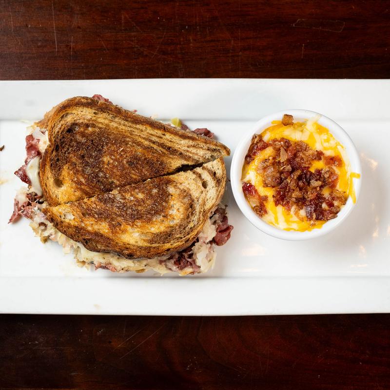 Grilled sliced corned beef topped with sauerkraut, Swiss cheese, and house-made Russian dressing on toasted marbled rye bread.